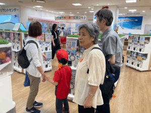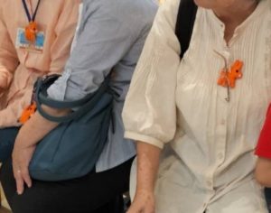 集合は、ノクティ上階にある高津市民館会議室。そこで全員が目印のオレンジ・ロバ隊長マスコットを身につけていざ出発。お孫さんと一緒に参加したTさんは9階のガシャポンコーナーへ、メガネの新調を考えてるHさんは7階のメガネ屋さんへ、と、あっという間にみんなが散っていきました。